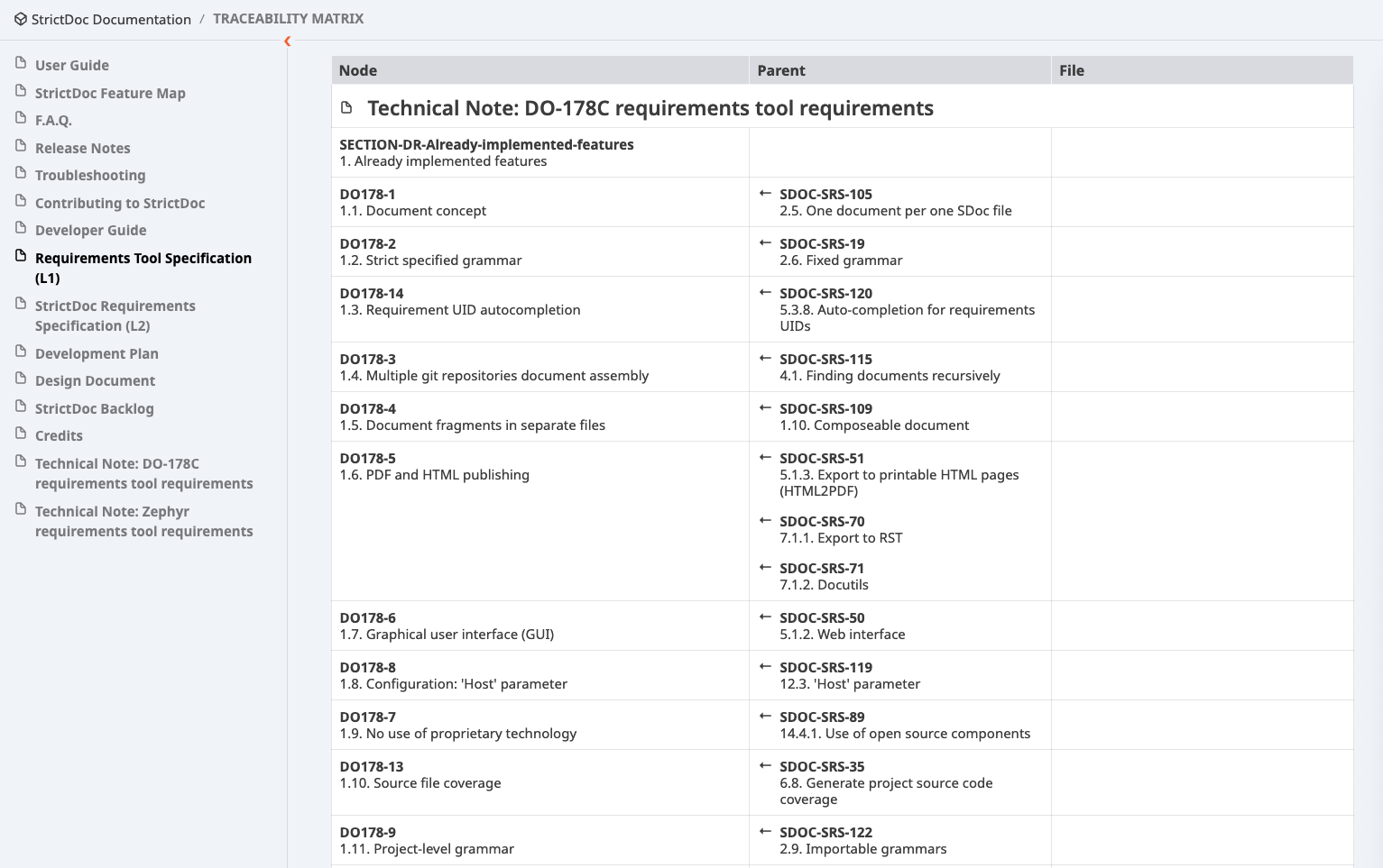 StrictDoc aims to provide simple yet rigorous requirements management that is sufficient to conform to standards like DO178C, ISO 26262, IEC 62443 (OT/control system security), EU Cloud Resilience Act, ECSS-E-ST-40C (a product software standard for the European Space Agency), ETSI-303645 (IoT security) and others. The requirements are kept in Git using plain text files with stable IDs and traceability links and the a CLI tool is used to produce a static site that can be used to consume the requirements and to link to them. The generated site offers traceability matrices and other features needed for standards conformance. Git itself serves as a basis for the configuration management.